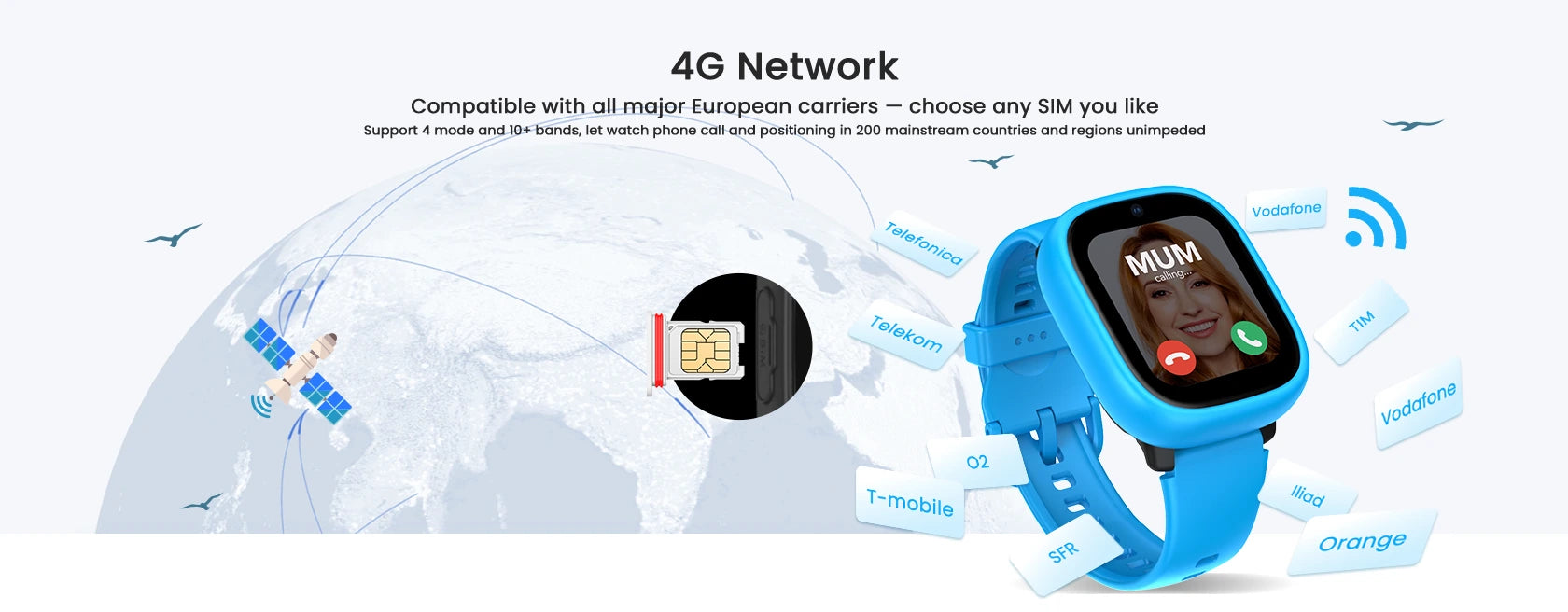 A: We do not force users to purchase specific sim card plan and contract. We support 4 mode and 10+ bands, let watch phone call and positioning in 200 mainstream countries and regions unimpeded.