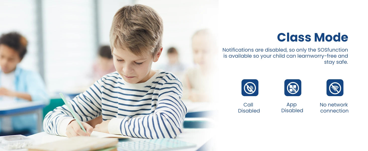 A: Yes! Our School Mode feature disables distractions like calls and games during class hours, ensuring kids stay focused while still allowing emergency communication.