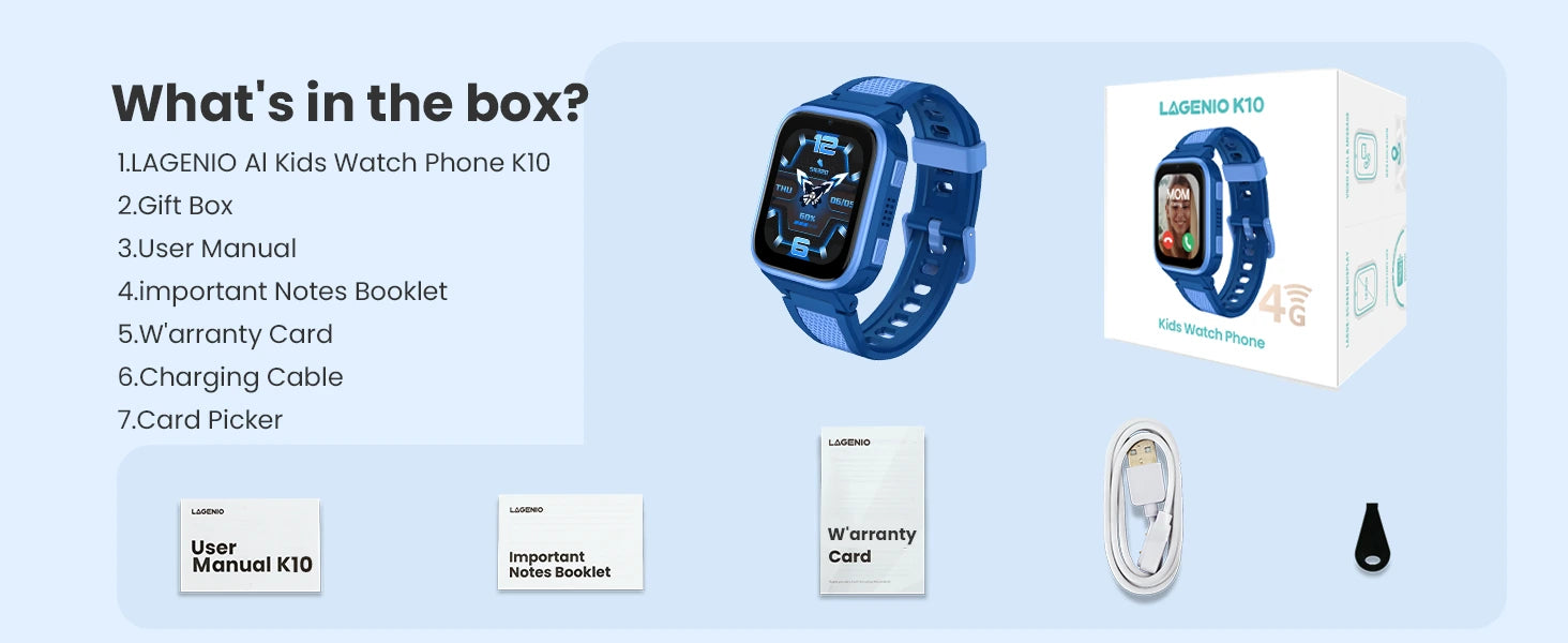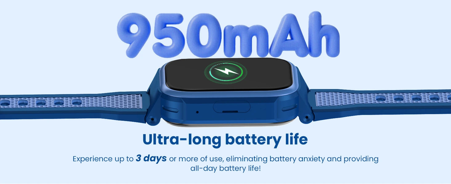 950mAh Mega Battery can use 3 days | Accurate GPS/Wifi/LBS/AGPS/ACC Tracking | Nio AI Learning Assistant | Voice, Video, Messaging Anywhere | 1.80 inches | SOS Button | IP68 Waterproof | Parental Control via LAGENIO App | Class Mode | No Social Media | No contract |